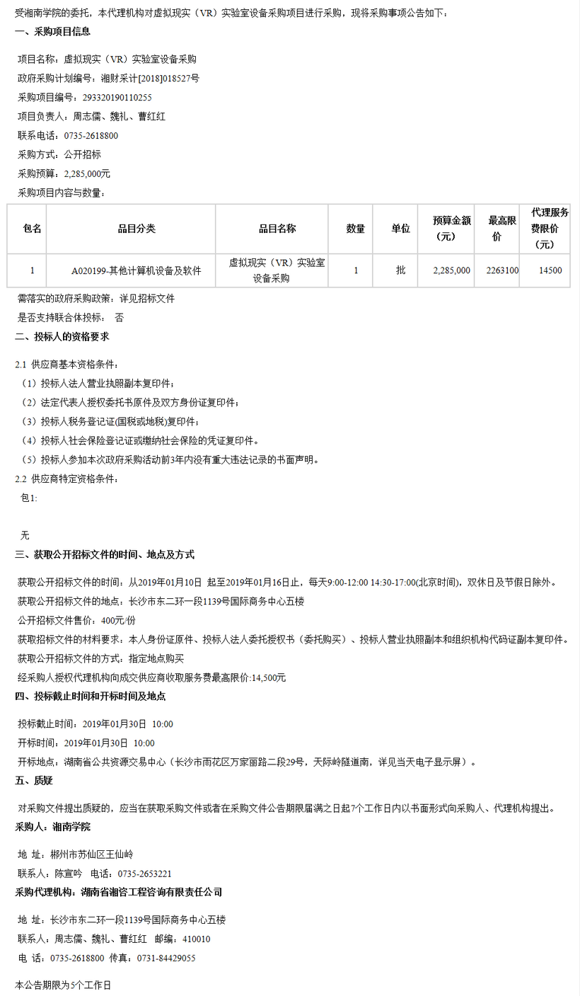 湘南學(xué)院虛擬現(xiàn)實(shí)(VR)實(shí)驗(yàn)室設(shè)備采購(gòu)項(xiàng)目公開(kāi)招標(biāo)公告