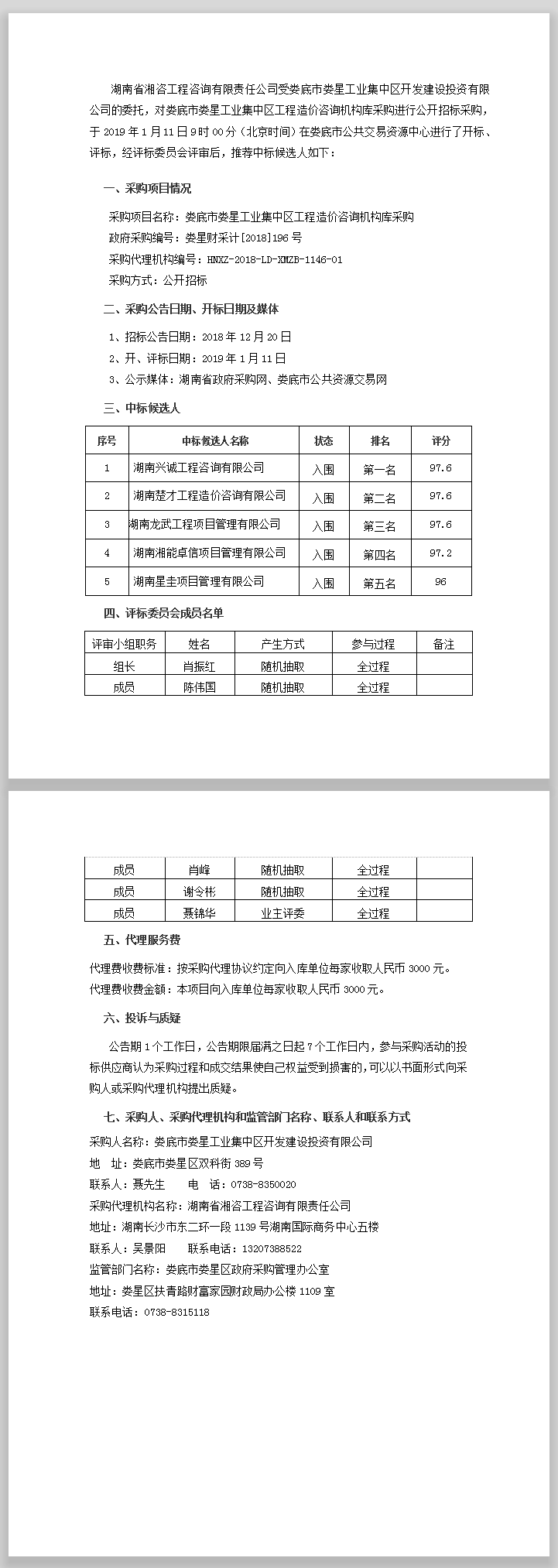 婁底市婁星工業(yè)集中區(qū)工程造價咨詢機構(gòu)庫采購公開招標中標公告