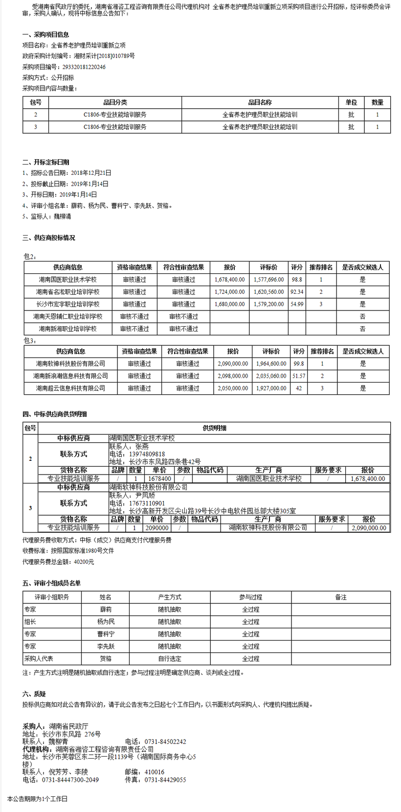 湖南省民政廳全省養(yǎng)老護理員培訓(xùn)重新立項公開招標(biāo)中標(biāo)公告