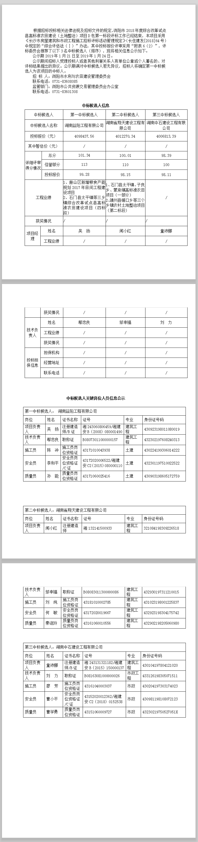 瀏陽市2018年度綜合改革試點縣高標(biāo)準(zhǔn)農(nóng)田建設(shè)(土地整治)項目D包第一標(biāo)段 中標(biāo)候選人公示