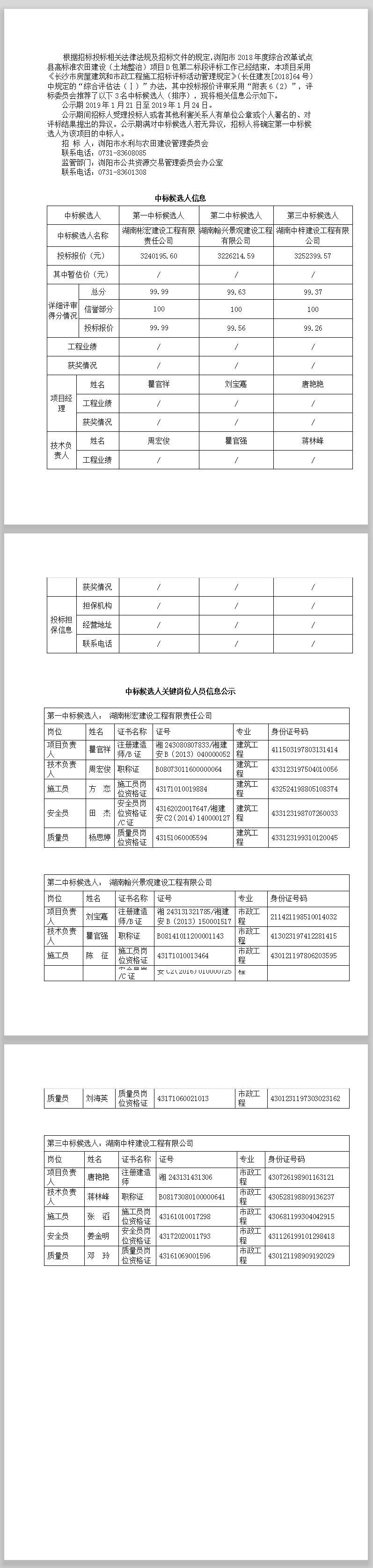 瀏陽市2018年度綜合改革試點縣高標準農(nóng)田建設(shè)(土地整治)項目D包第二標段 中標候選人公示