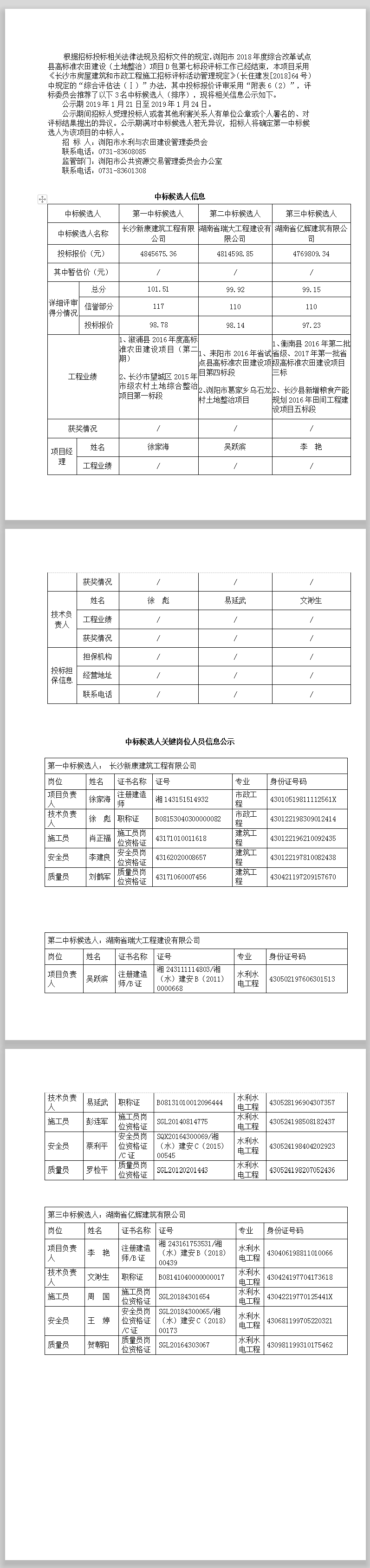 瀏陽市2018年度綜合改革試點縣高標準農(nóng)田建設(shè)(土地整治)項目D包第七標段 中標候選人公示