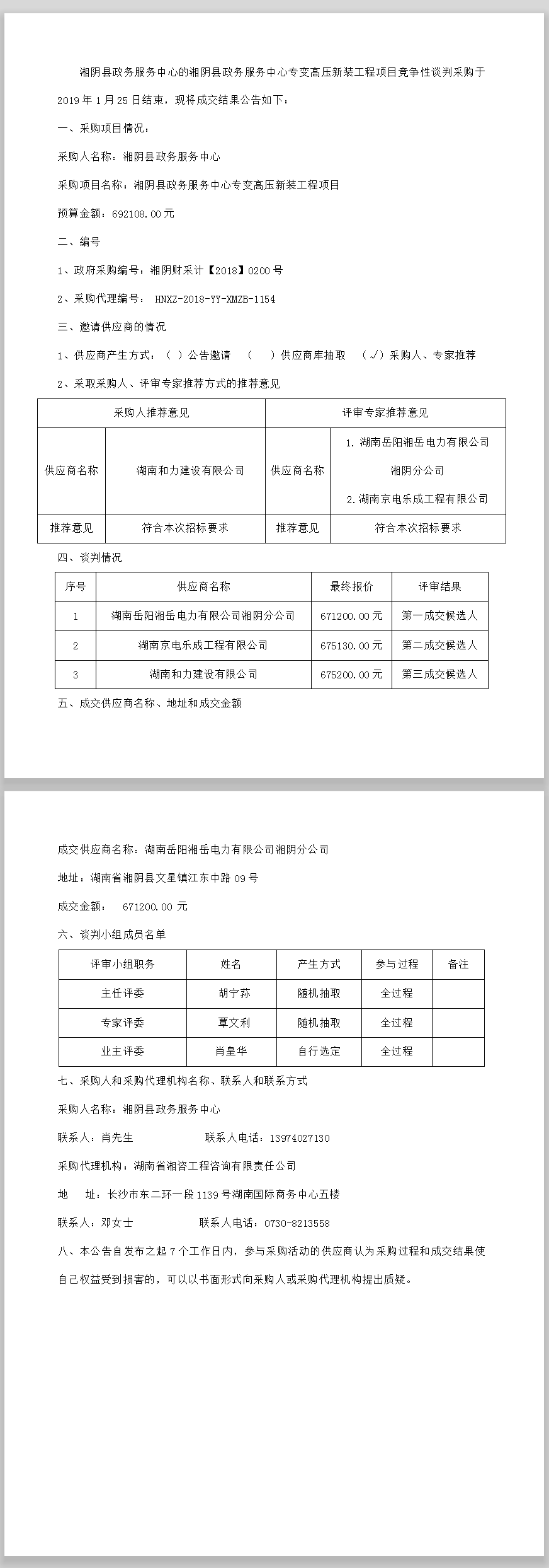 湘陰縣政務服務中心專變高壓新裝工程項目競爭性談判成交結(jié)果公告