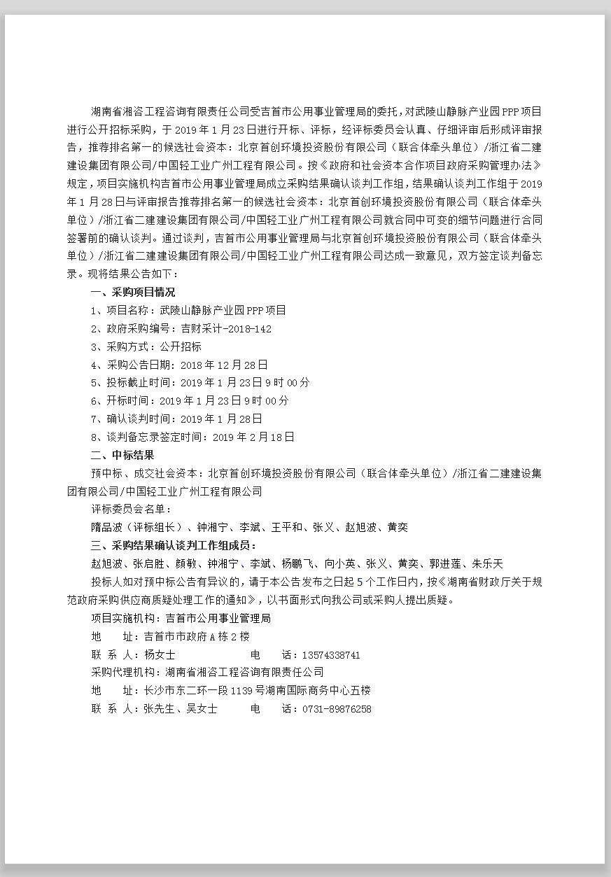 武陵山靜脈產(chǎn)業(yè)園PPP項(xiàng)目預(yù)中標(biāo)結(jié)果公示