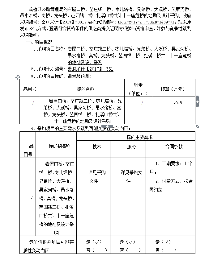 巖屋口橋、岔莊線二橋、棗兒塔橋、兄弟橋、大溪橋、吳家河橋、吊水洛橋、高橋,龍頭橋,芭四線二橋、扎溪口橋共計十一座危橋的地勘及設(shè)計采購 談判公告