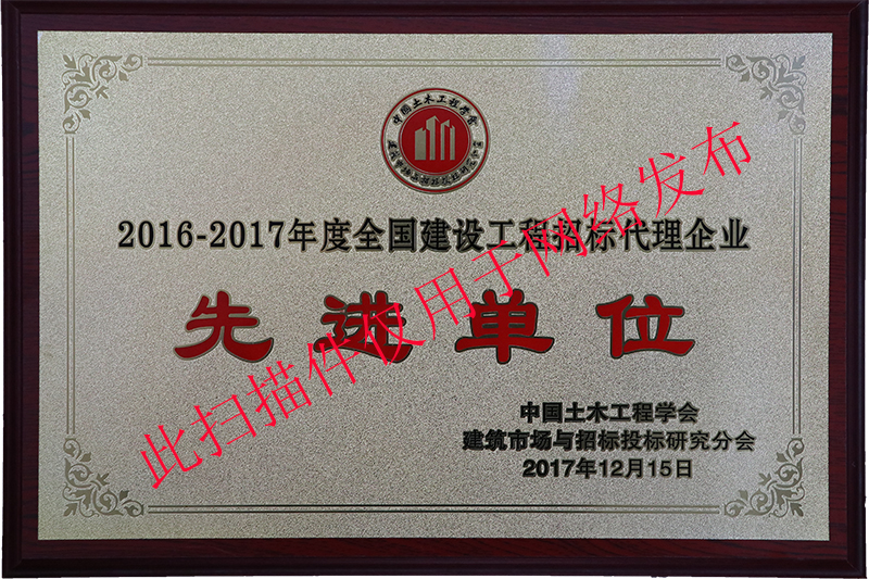 公司獲得中國(guó)土木工程學(xué)會(huì)建筑市場(chǎng)與招標(biāo)投標(biāo)研究分會(huì)頒發(fā)的2016-2017年度全國(guó)建設(shè)工程招標(biāo)代理企業(yè)“先進(jìn)單位”。