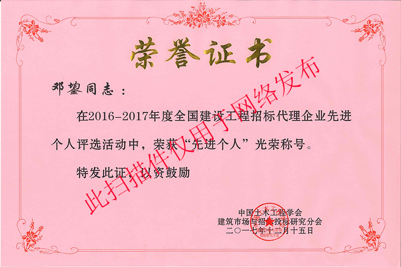 公司鄧鋆總經(jīng)理獲得中國土木工程學(xué)會(huì)建筑市場(chǎng)與招標(biāo)投標(biāo)研究分會(huì)頒發(fā)的2017年度全國建設(shè)工程招標(biāo)代理企業(yè)先進(jìn)個(gè)人稱號(hào)