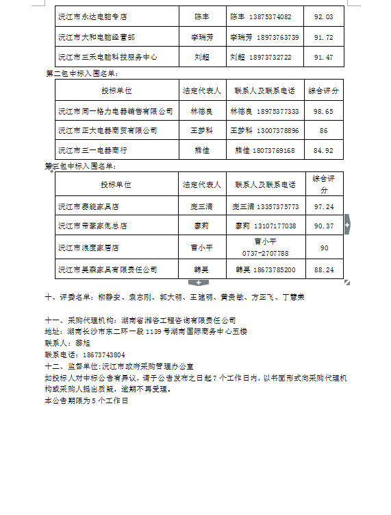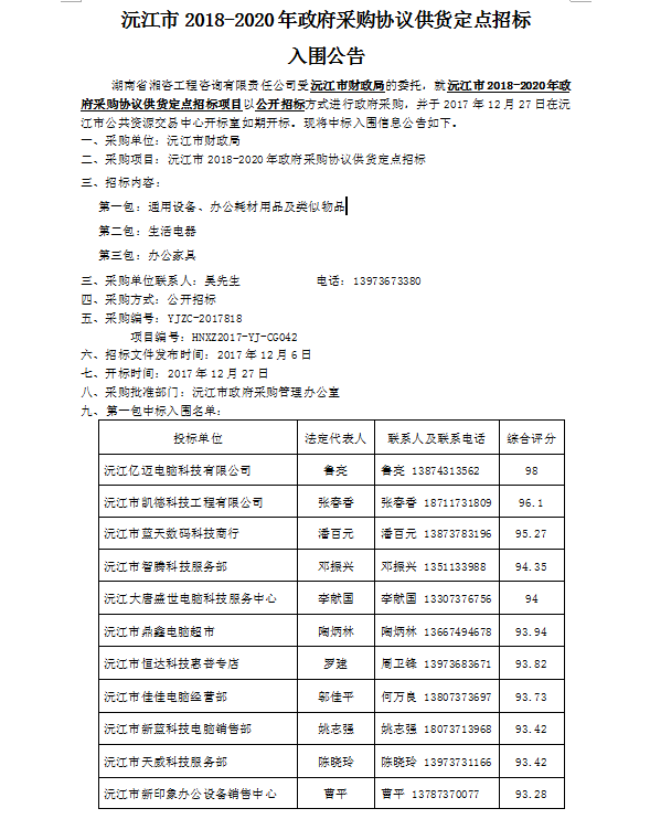 沅江市2018-2020年政府采購協(xié)議供貨定點招標(biāo) 入圍公告