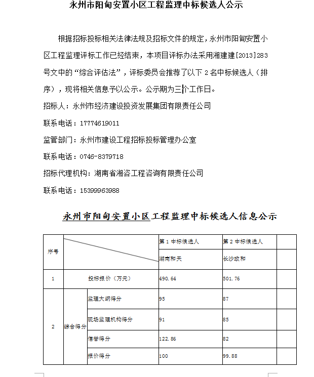 永州市陽(yáng)甸安置小區(qū)工程監(jiān)理中標(biāo)候選人公示