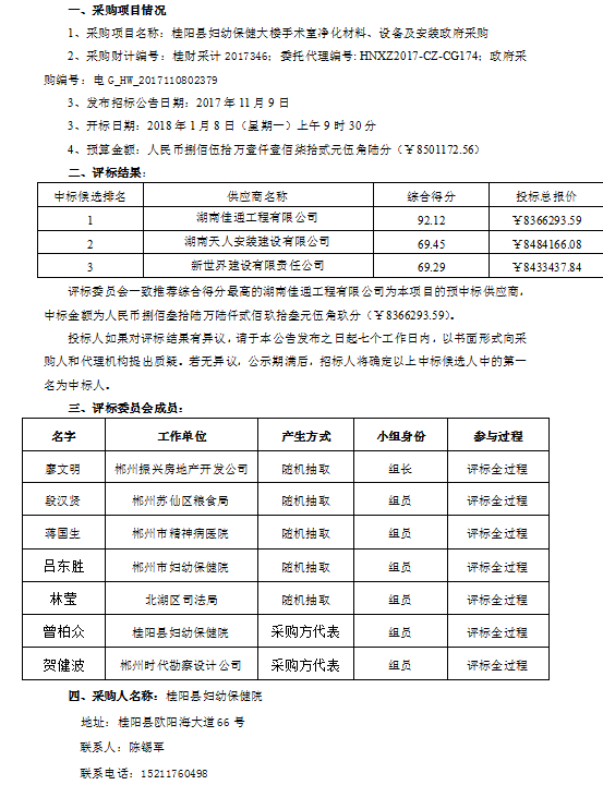 桂陽縣婦幼保健大樓手術(shù)室凈化材料、設(shè)備及安裝政府采購 評標(biāo)結(jié)果公示