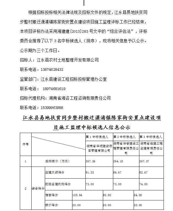 江永縣易地扶貧同步整村搬遷瀟浦鎮(zhèn)陳家街安置點建設(shè)項目施工監(jiān)理中標(biāo)候選人公示