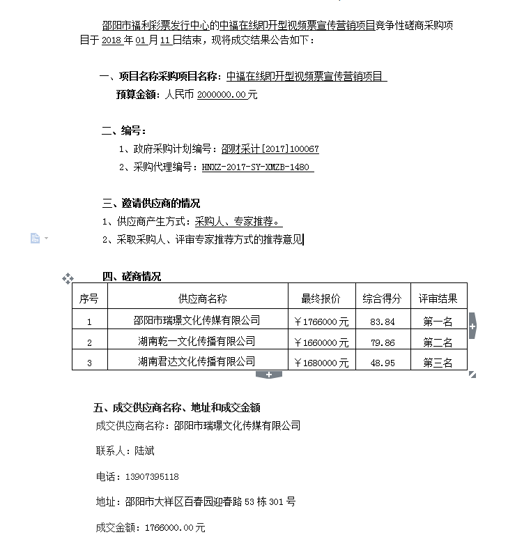 中福在線即開型視頻票宣傳營銷項(xiàng)目 競爭性磋商成交公告