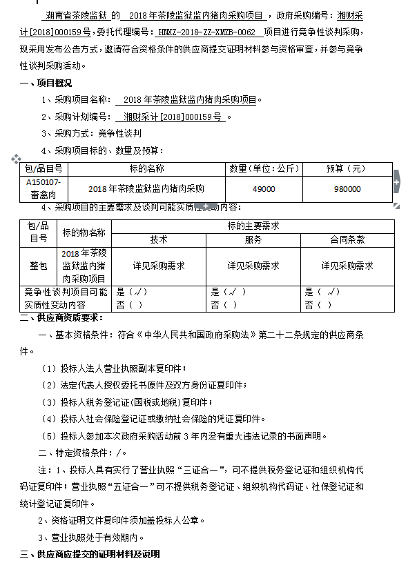 2018年茶陵監(jiān)獄監(jiān)內(nèi)豬肉采購項目招標(biāo)公告