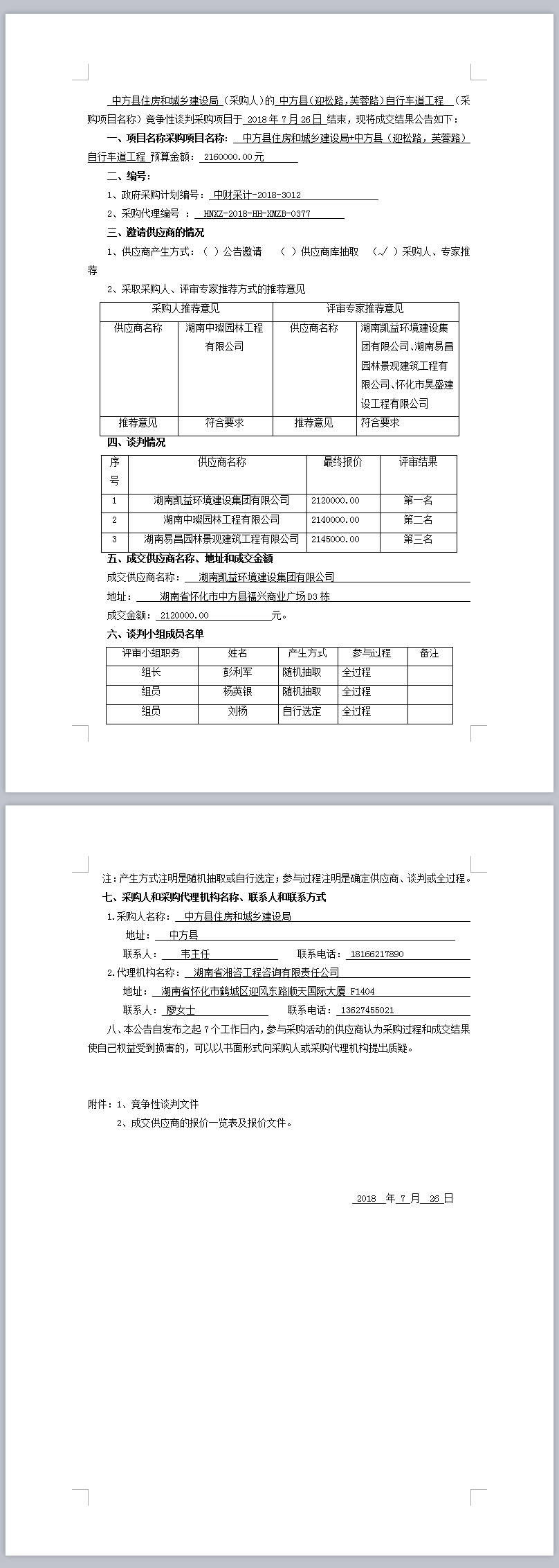 中方縣住房和城鄉(xiāng)建設局+中方縣(迎松路,芙蓉路)自行車道工程競爭性談判成交結果公告