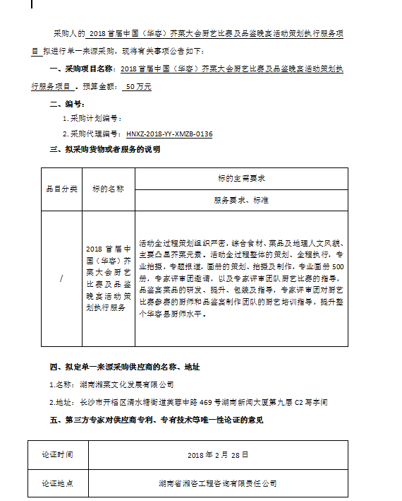 2018首屆中國(華容)芥菜大會廚藝比賽及品鑒晚宴活動策劃執(zhí)行服務(wù)項目單一來源公告