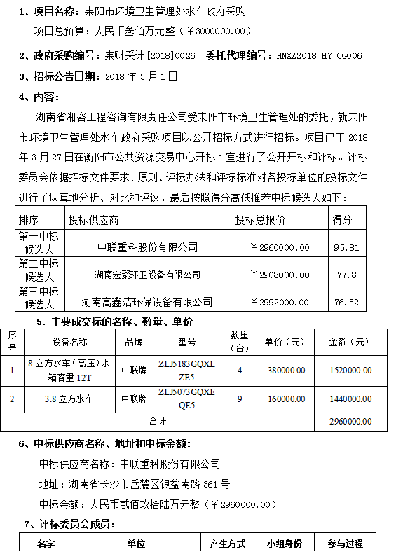 耒陽(yáng)市環(huán)境衛(wèi)生管理處水車政府采購(gòu)評(píng)標(biāo)結(jié)果公示