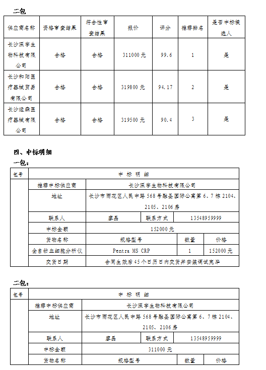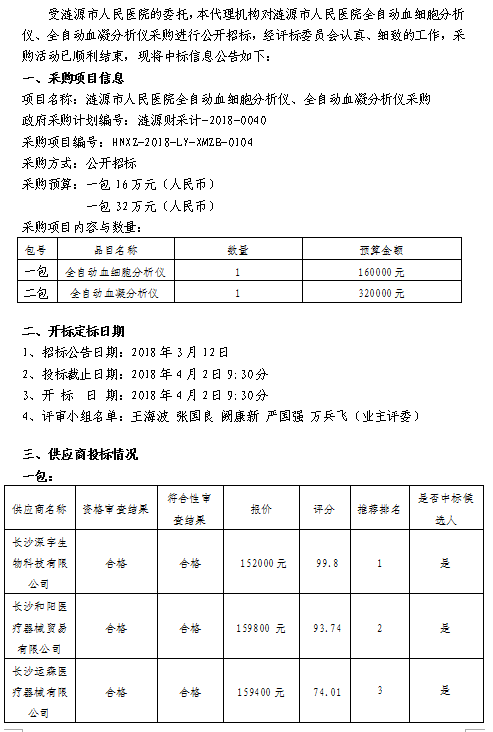 漣源市人民醫(yī)院全自動(dòng)血細(xì)胞分析儀、全自動(dòng)血凝分析儀采購中標(biāo)結(jié)果公告