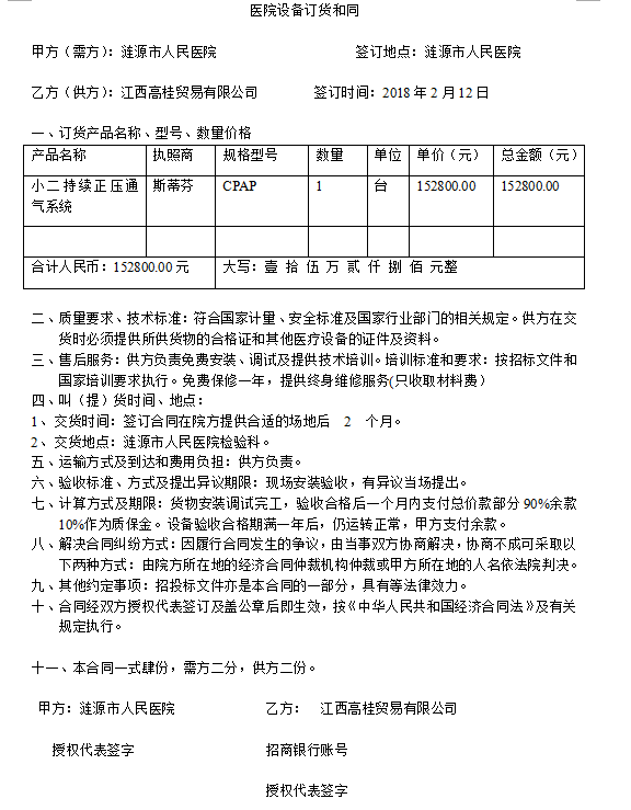 漣源市人民醫(yī)院小兒專用無創(chuàng)呼吸機采購合同