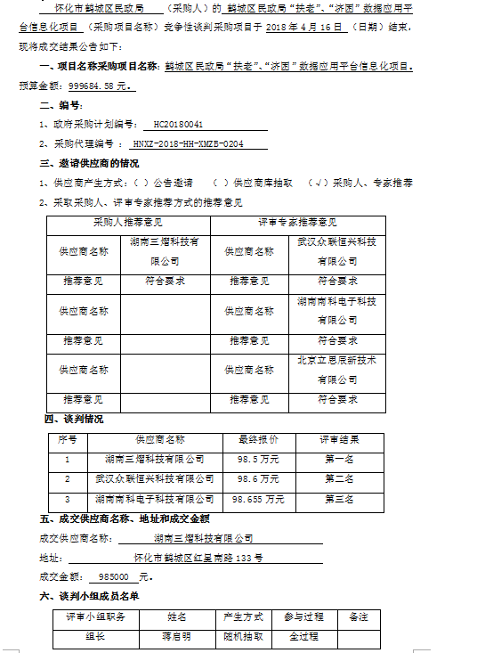 鶴城區(qū)民政局“扶老”、“濟困”數(shù)據(jù)應(yīng)用平臺信息化項目成交公告