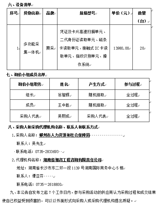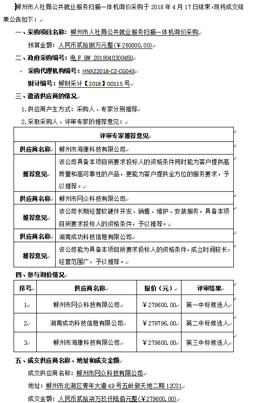 郴州市人社局公共就業(yè)服務(wù)掃描一體機(jī)詢價(jià)采購成交結(jié)果公告