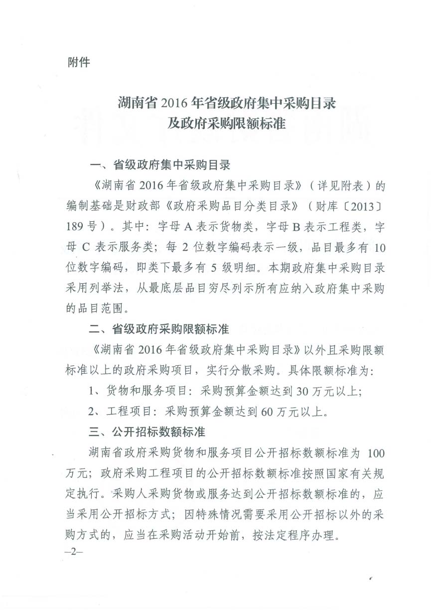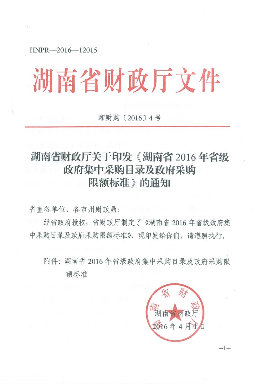 湖南省財(cái)政廳關(guān)于印發(fā)《湖南省2016年省級政府集中采購目錄及政府采購限額標(biāo)準(zhǔn)》的通知
