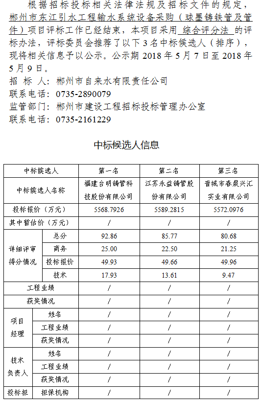 郴州市東江引水工程輸水系統(tǒng)設(shè)備采購(球墨鑄鐵管及管件)中標(biāo)候選人公示